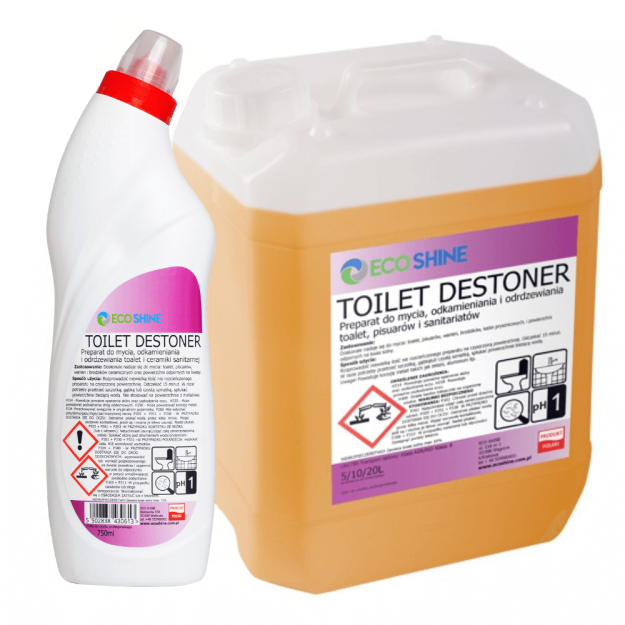 ECO SHINE TOILET DESTONER 0,75L Zagęszczony preparat czyszczący do mycia: toalet, pisuarów, wanien, brodzików. Usuwa najmocniej przywarty kamień i rdzawe zacieki.