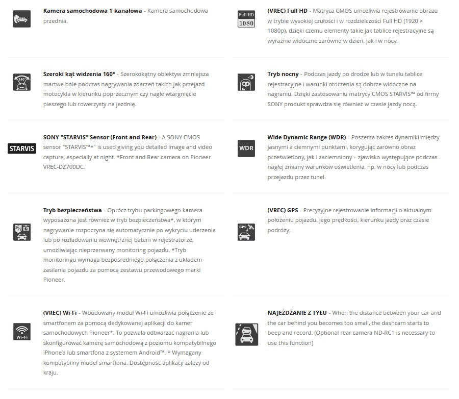 | Aplikacja mobilna | Aplikacja Pioneer „Dash Camera Interface” |